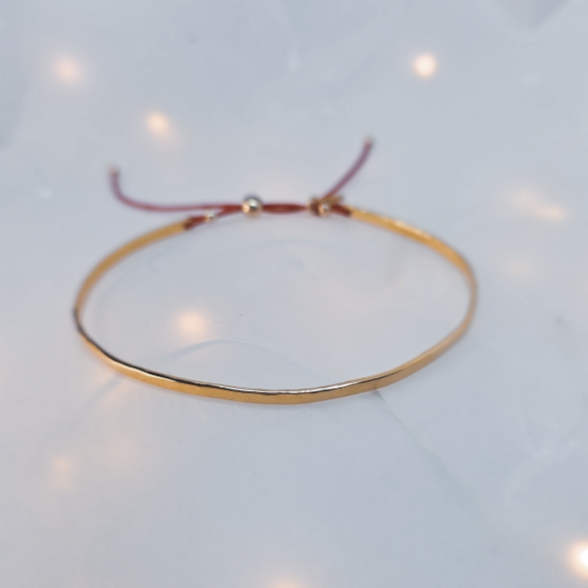 Guide des taillesJonc Ruban, délicatement martelé. Jonc en plaqué Or 3 microns. Le jonc se ferme par un lienréglable rouge et un petit sequin.